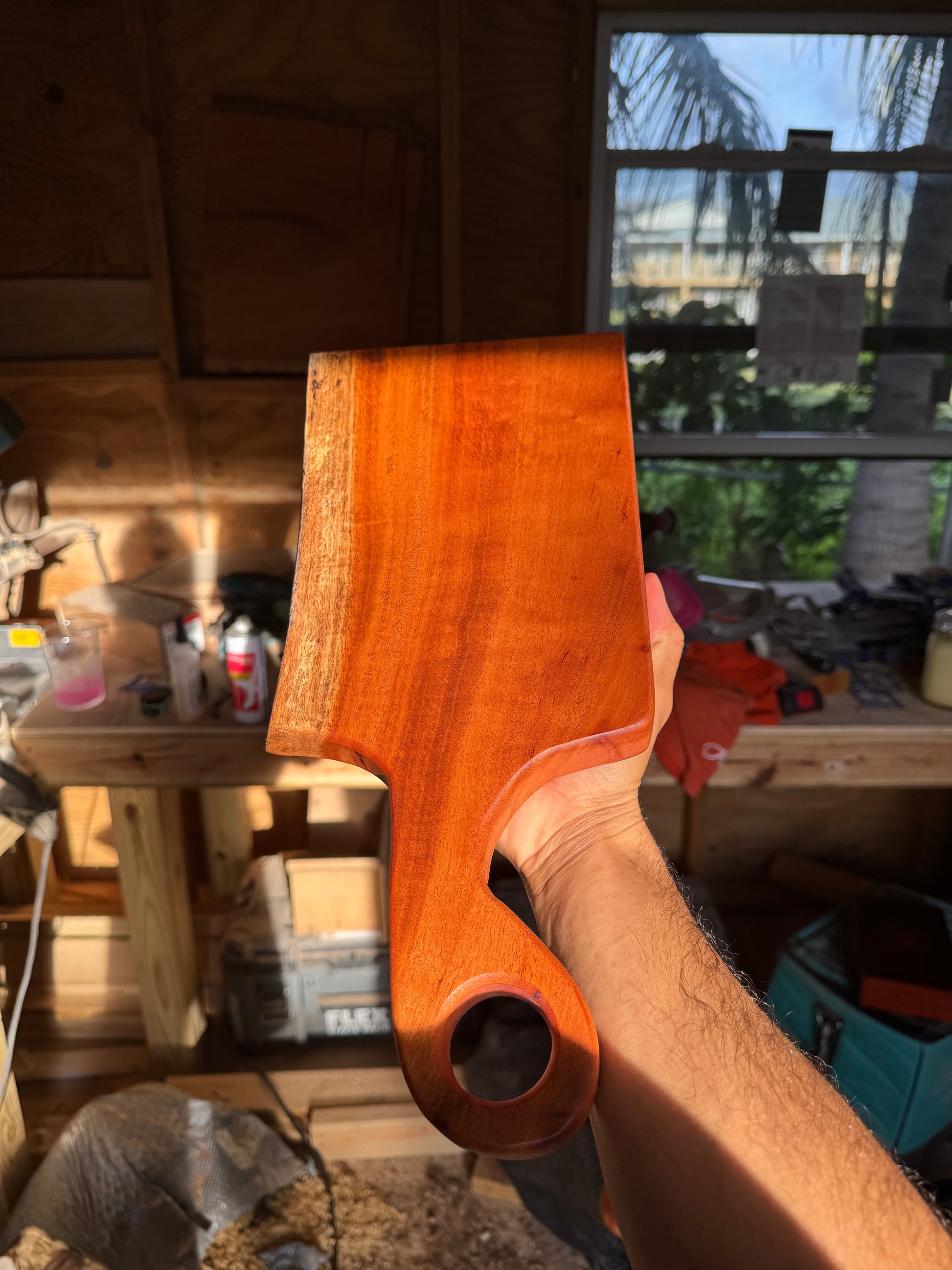 Cayman Mahogany Charcuterie Board: hand made, premium Cayman mahogany board with rich, warm grain. Generous 16" by 8" surface provides ample space for cheeses, meats, and accoutrements. Smooth, food-safe beeswax mineral oil finish, highlights natural color and depth while protecting the wood. Ergonomic handle cutout for easy carrying and a natural edge that adds rustic sophistication. A timeless centerpiece for entertaining or everyday serving, built to endure with everyday use.
