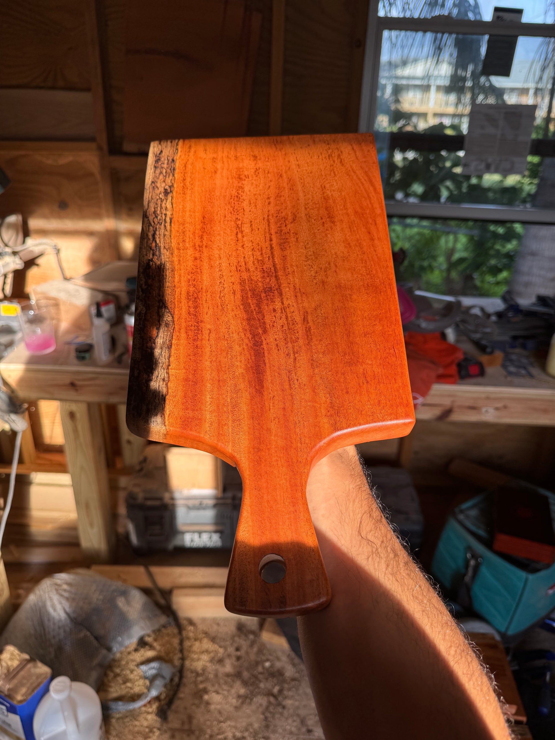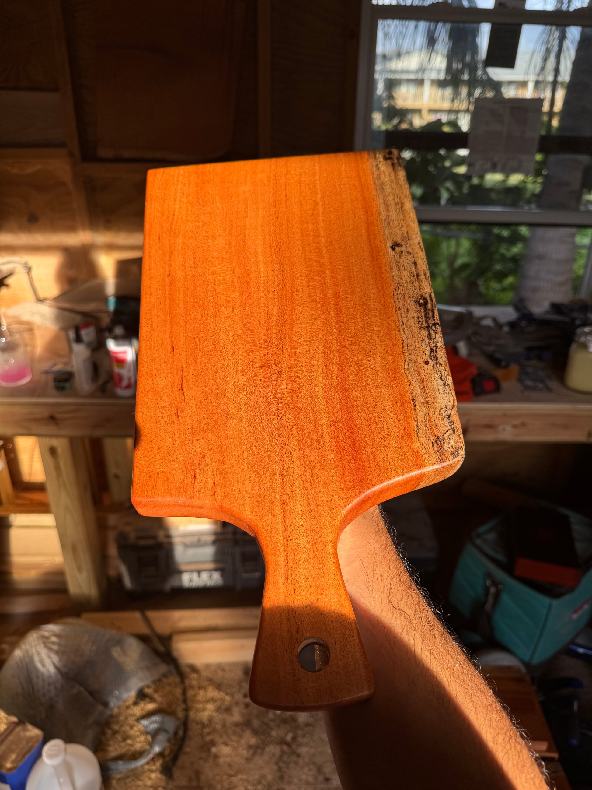 Cayman Mahogany Charcuterie Board (16” x 8”): crafted in Cayman mahogany for rich, resonant tones and distinctive grain. The 16" x 8" surface accommodates a variety of cheeses and toppings. Sealed with your beeswax mineral oil mix, delivering a durable, food-safe finish that nourishes the wood. Comfortable handle cutout and a subtle live-edge detail add character and ease of